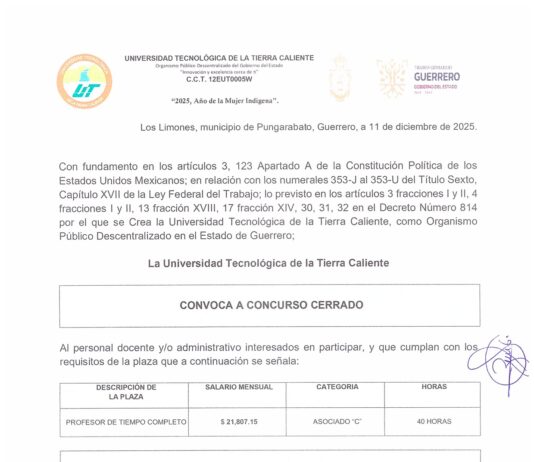 Convocatoria cerrada para la plaza de Profesor de Tiempo Completo de la Universidad Tecnológica de la Tierra Caliente.